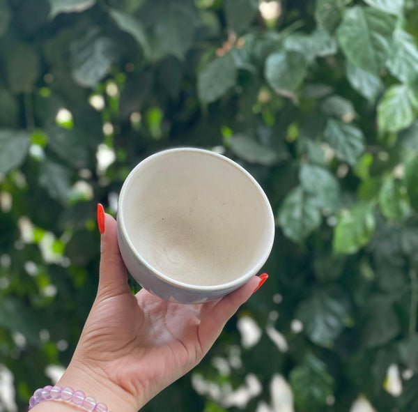 A stunning bowls that blend modern shape with rustic charm. These bowls feature a contemporary square form with rounded corners. The exterior boasts a sophisticated Soft Grey/Dusty Blue glaze, hand-painted with a beautiful, contrasting White Leaf or Petal motif around the base. The interior is finished in a smooth, bright white glaze.