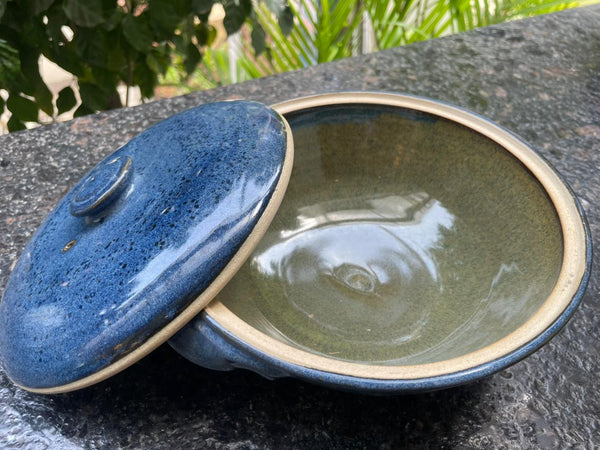 Bring the tranquil beauty of the ocean to your dining table with this stunning lidded casserole pot. Finished in a rich, speckled Azure Blue & green glaze, the surface offers a beautiful depth of color. The contrasting natural stoneware rim adds an earthy detail, while the subtle side handles ensure an easy grip.